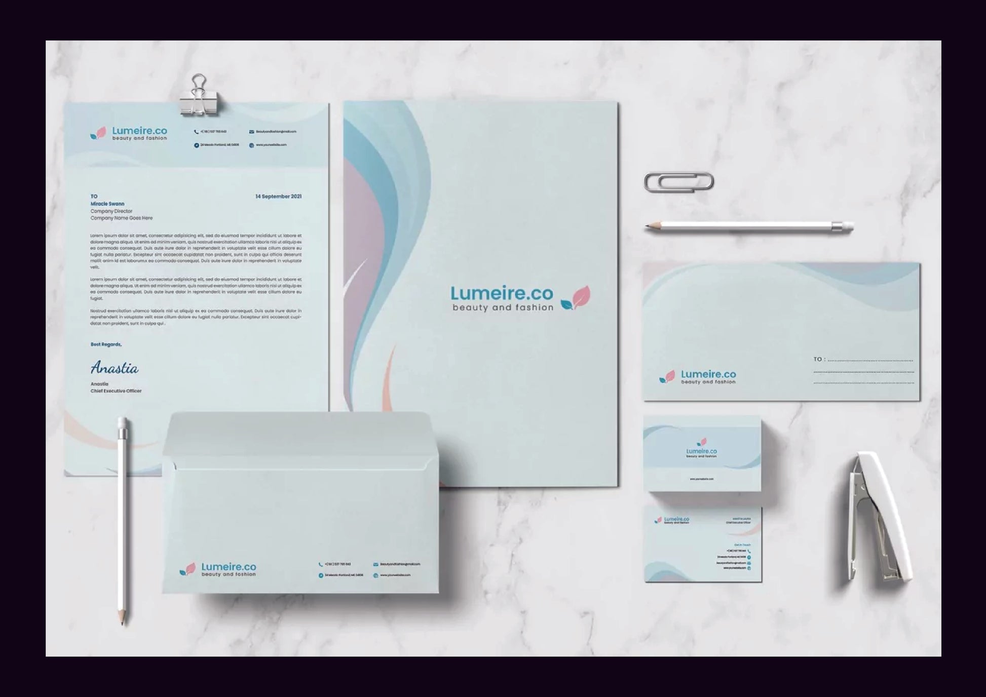 - Includes: Business Card (2 sizes), Letterhead (2 sizes), Folder for Documents (2 sizes), Envelope